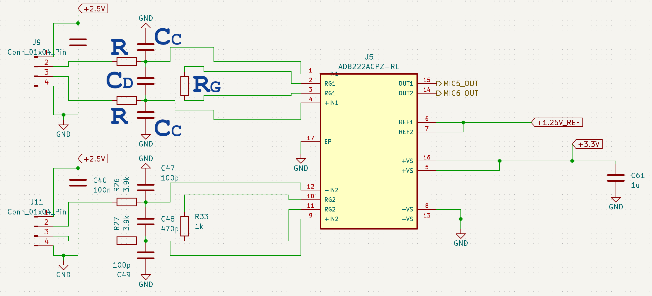 \[G = 1 + \frac{49.4kΩ}{R_G} = 1 + \frac{49.4kΩ}{1kΩ} = 50.4\]To avoid high frequency rectification and thus signal distortions, additional filtering is applied at the input. The filter limits the input signal bandwidth according to the following relationships: