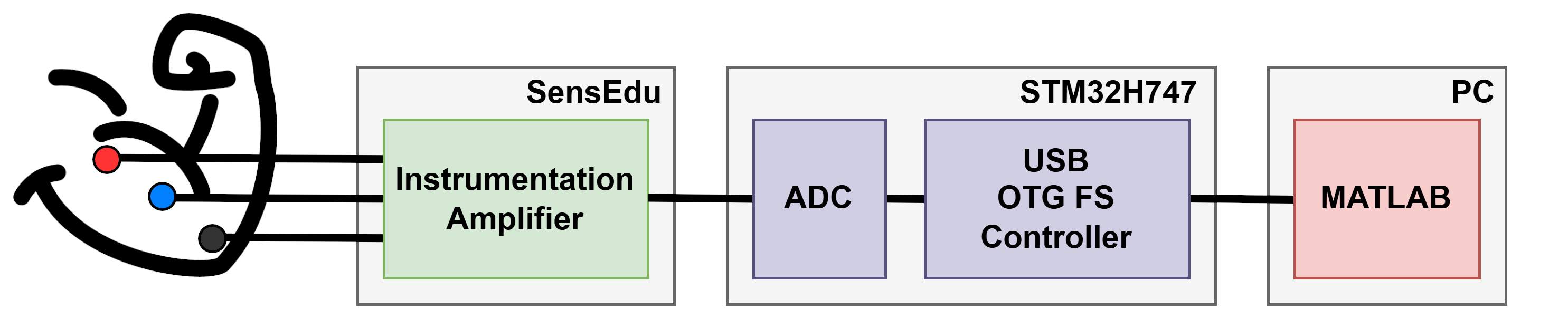 In SensEdu, we demonstrate how basic biceps contraction can be used to simulate keyboard press logic, with latency of ~100–200ms. We use the most basic circuit design combined with signal processing in MATLAB.