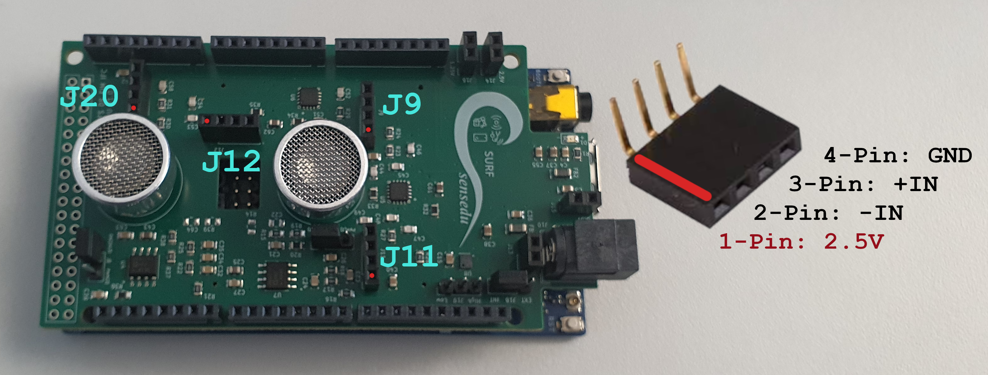 The system supports up to 4 EMG probes, which can be connected via female 4-Pin 2.54 headers: J9, J11, J12, and J20.