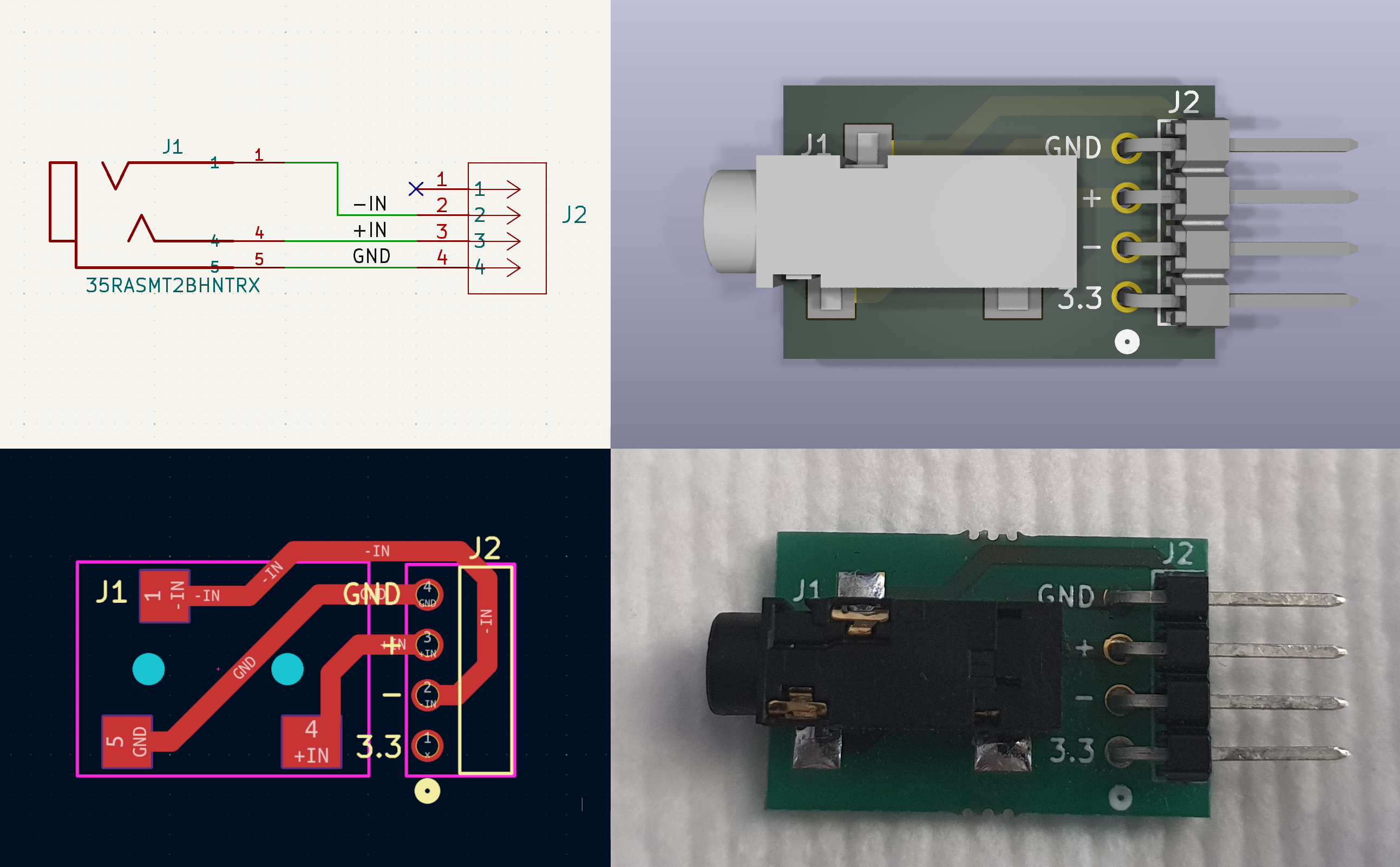 MiniJack2Jumper adapter: Schematics, PCB view, 3D view, and real-life view