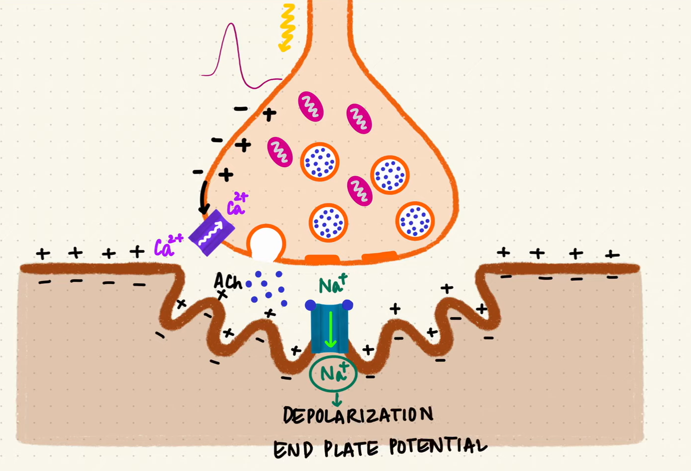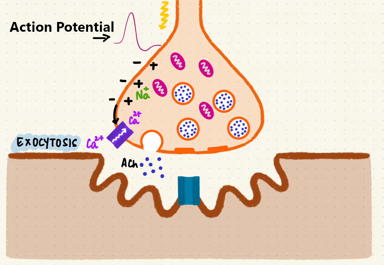 Continuous depolarization of the cell membrane subsequently activates voltage-gated calcium channels. Calcium ions (Ca²⁺) flow into the cell which triggers little containers with neurotransmitters to fuse with the membrane and release Acetylcholine (ACh).