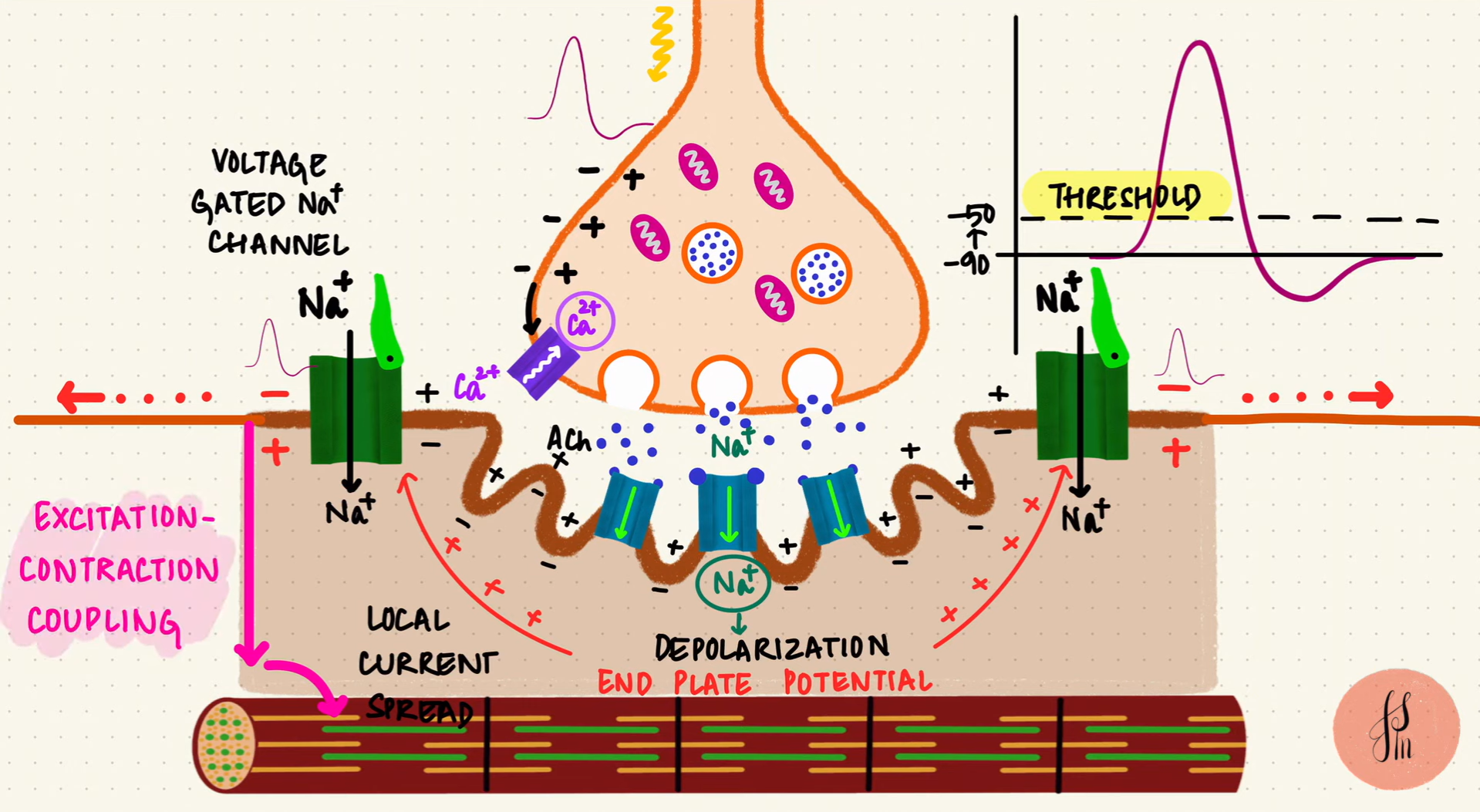 As more ACh molecules bind to their receptors, the membrane voltage continues to rise. Once it reaches a threshold of approximately -50 mV, voltage-gated sodium channels open, allowing sodium ions (Na⁺) to rush into the muscle cell. This influx of sodium completes the process of membrane depolarization and generates an Action Potential. This electrical signal propagates along the muscle membrane, eventually leading to a muscle contraction.